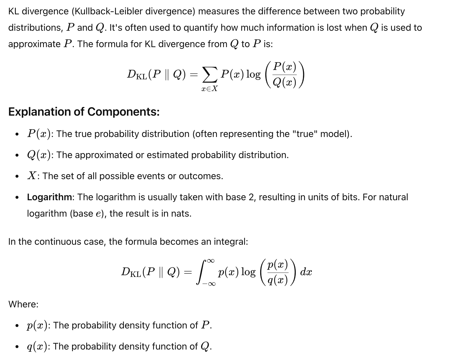 KL divergence quantifies the difference between two probability distributions, typically denoted as (true distribution) and (approximated distribution). It answers the question: