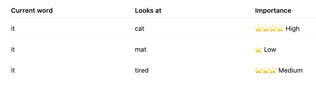 tired ← medium attentionThis helps the model learn that it = cat