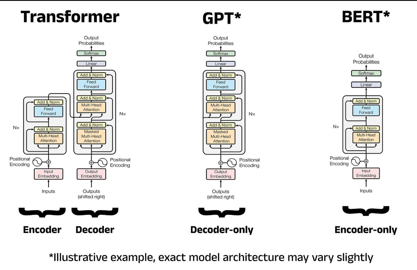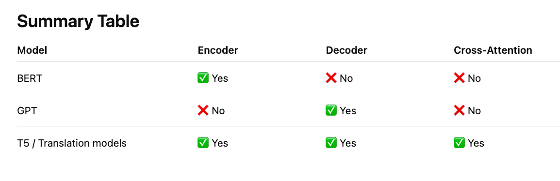 Note: Cross-attention happens only in encoder–decoder architectures. Encoder-only (BERT) and decoder-only (GPT) models use self-attention.